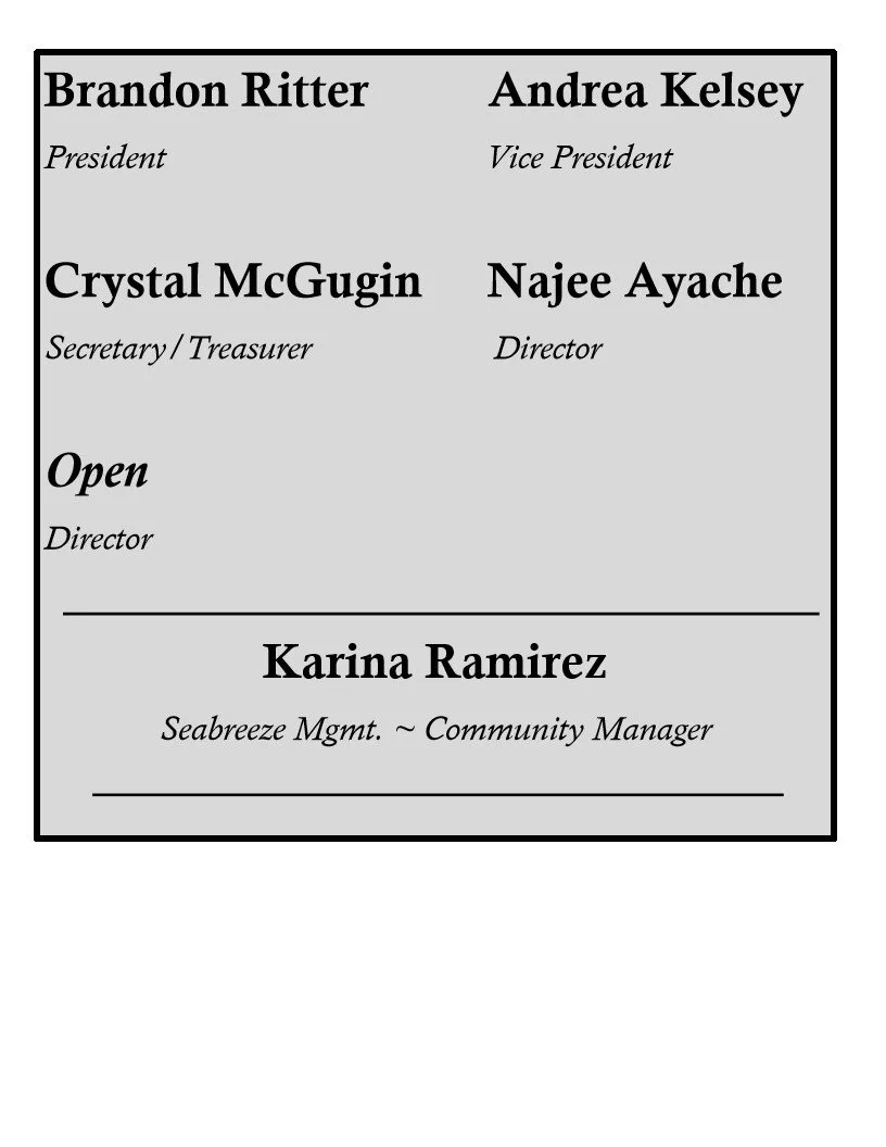 You can also always email our Community Manager - Karina Ramirez at karina.ramirez@seabreezemgmt.com or call Seabreeze Customer Support at 800-232-7517. Or use the link below to email Tiffany right from this page.